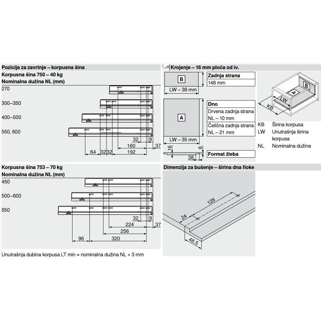 ‣ Legrabox klizač Blumotion L500mm/40KG L+D 750.5001B